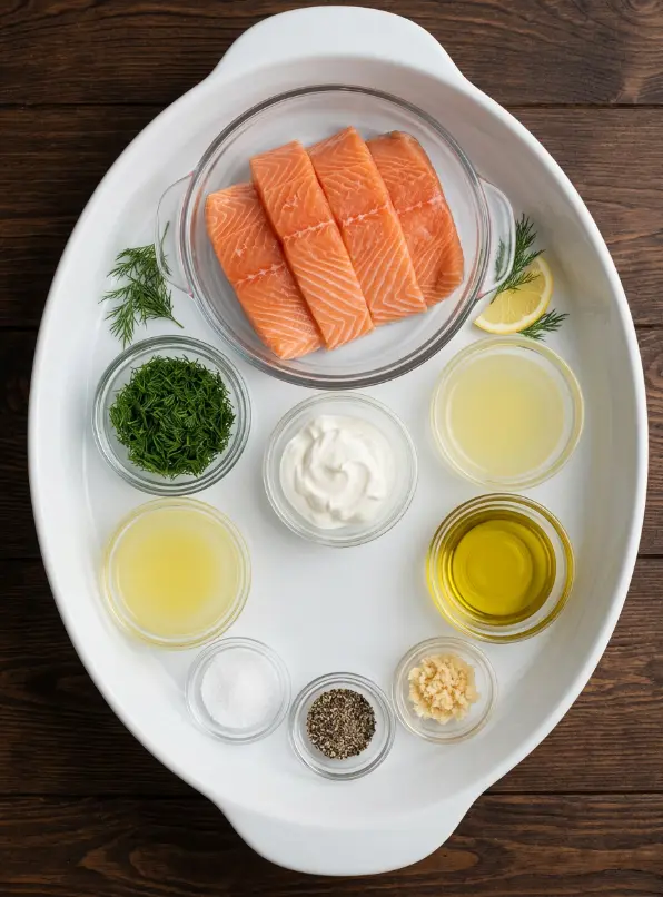 Gather these simple, fresh ingredients for your 20-minute baked salmon with dill sauce. This recipe serves 4 and uses pantry staples with vivid, sensory appeal—think buttery salmon kissed by herbaceous dill and tangy lemon.