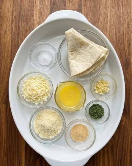 Cheesy Tortilla Garlic Bread Ingredients (Makes 4 large tortillas = 16–32 pieces depending on how you slice)