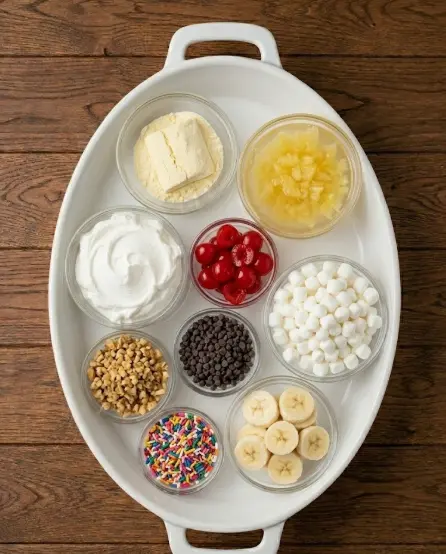 Banana Split Fluff Ingredients (Serves 8–10 — double it, seriously)