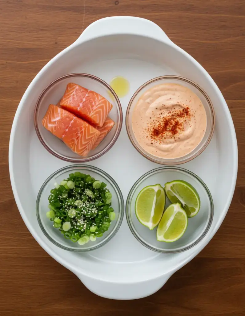 Gather these fresh ingredients for your Bang Bang Salmon recipe—enough for 4 servings. I’ve included sensory notes and smart substitutions to make it your go-to among salmon recipes.