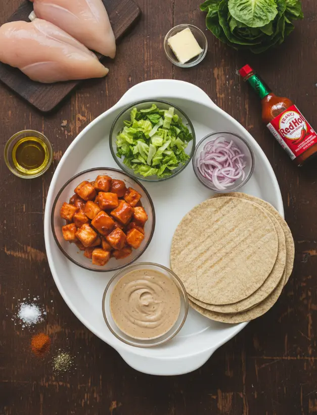 - Buffalo-coated chicken pieces (approximately ½ cup per wrap)