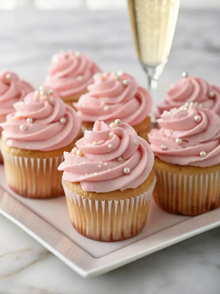 Serve these Champagne Cupcakes Recipe delights on a tiered stand for visual appeal, paired with fresh berries for a pop of tartness—ideal for brunches or weddings. Personalize for audiences: Top with edible flowers for a romantic touch, or gold leaf for luxury events. Pair with coffee for afternoons or actual champagne for evenings. For versatility, mini versions work as appetizers—readers, try linking to our related floral cupcake ideas post for more inspiration.