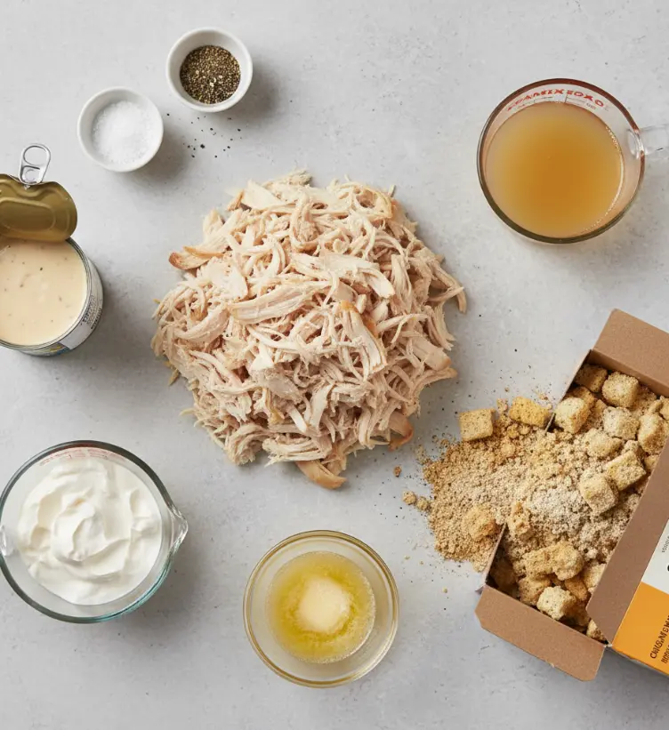 Creating the perfect chicken and stuffing casserole starts with quality ingredients that work harmoniously together. Here’s everything you’ll need to craft this comforting masterpiece: