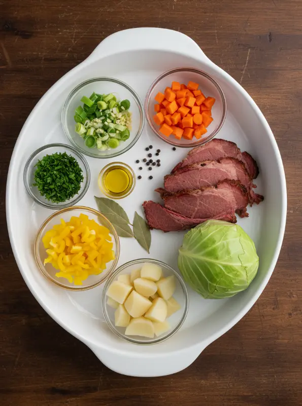 Gather these fresh, wholesome ingredients for your Corned Beef and Cabbage Soup—the kind that fills your kitchen with irresistible aromas of garlic, herbs, and simmering brisket. This recipe serves 6-8 generous portions, yielding a flavorful broth that’s naturally gluten-free and veggie-packed.