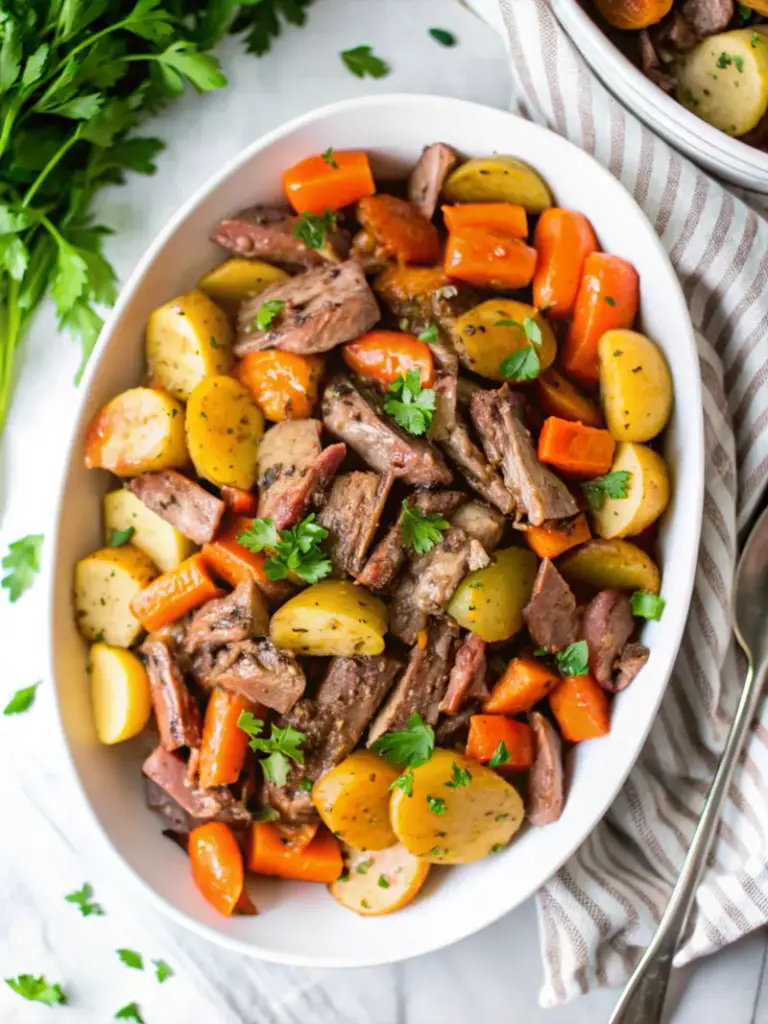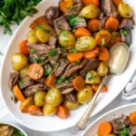 Un rôti de bœuf ultra tendre mijoté lentement, avec des pommes de terre fondantes, des carottes et une sauce riche et savoureuse, parfait pour le réconfort.
