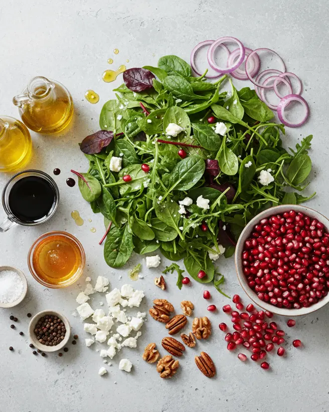 - Assemble the Salad: In a large bowl, gently combine greens, pomegranate seeds, feta, and thinly sliced red onion.