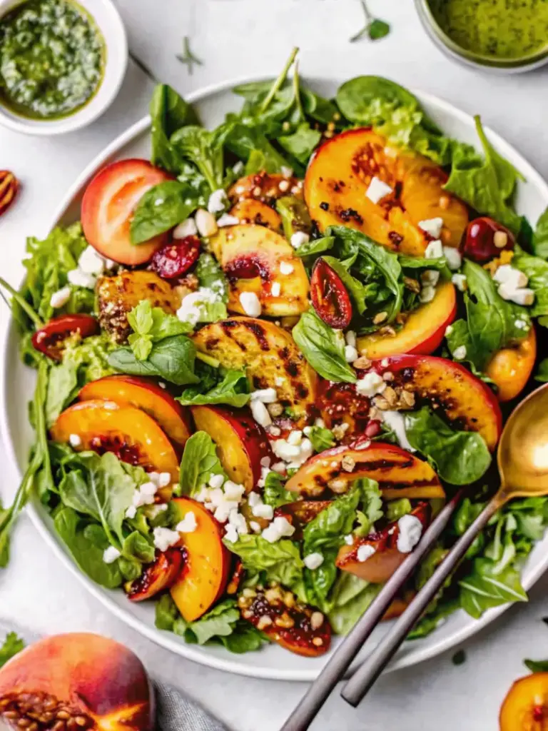 A vibrant summer salad made with smoky grilled peaches, fresh leafy greens, creamy avocado, tangy goat cheese, crunchy pistachios, and a bright homemade basil vinaigrette.