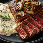 Steak With Haunted Bourbon Garlic Cream Sauce features perfectly seared ribeye steaks topped with a rich, smoky bourbon garlic cream sauce. This decadent steak dinner blends bold bourbon flavor, aromatic garlic, and velvety cream for a gourmet yet easy stovetop recipe perfect for special occasions or weeknight indulgence.