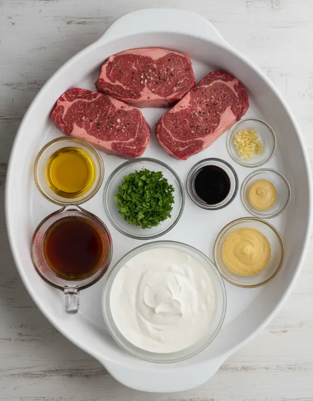 These ingredients yield 4 servings, blending classic steak elements with NLP-rich terms like creamy bourbon reduction, garlic-infused sauce, and pan-seared ribeye for semantic search appeal.