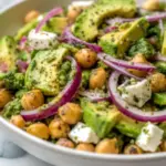 In a large mixing bowl, gently combine the drained chickpeas, diced avocado, crumbled feta cheese, thinly sliced red onion, chopped parsley, and chopped mint. The key here is using a wide, shallow bowl that gives you ample space to toss without crushing delicate ingredients. If you’re adding tomatoes or olives (highly recommended for authenticity), now’s the time to include them—these ingredients appear in nearly all traditional Mediterranean chickpea salads.