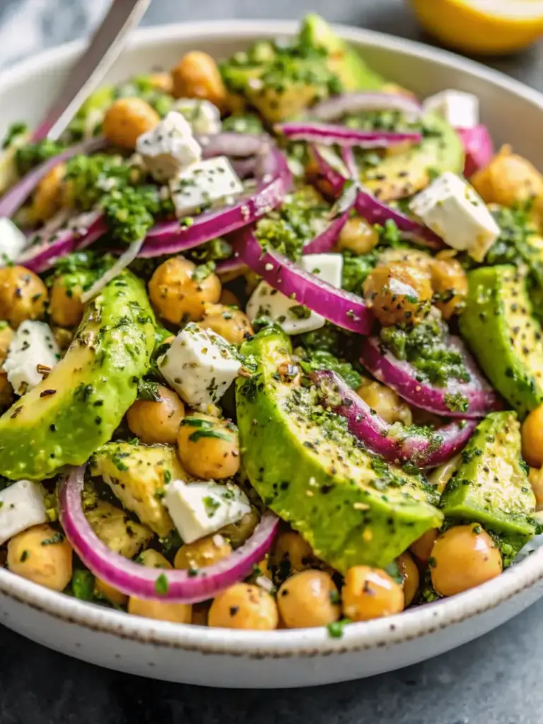 This salad delivers impressive nutritional benefits: chickpeas provide sustained energy through complex carbohydrates and fiber, while the olive oil and avocado contribute heart-healthy monounsaturated fats that actually enhance absorption of fat-soluble vitamins from the other ingredients. The combination of plant-based protein from chickpeas and dairy protein from feta creates a complete amino acid profile rarely found in vegetarian dishes.