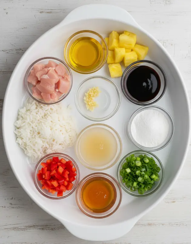 These ingredients create a symphony of textures: crispy chicken edges, chewy rice, and juicy pineapple pops. Pro tip: Prep everything mise en place for seamless cooking.