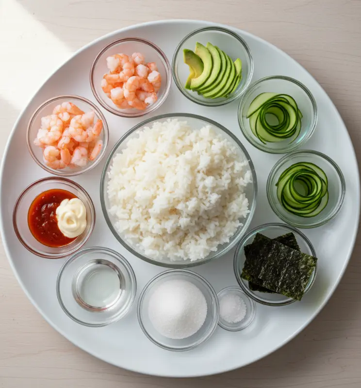 Creating the perfect spicy shrimp sushi stack starts with quality ingredients. Here’s everything you’ll need: