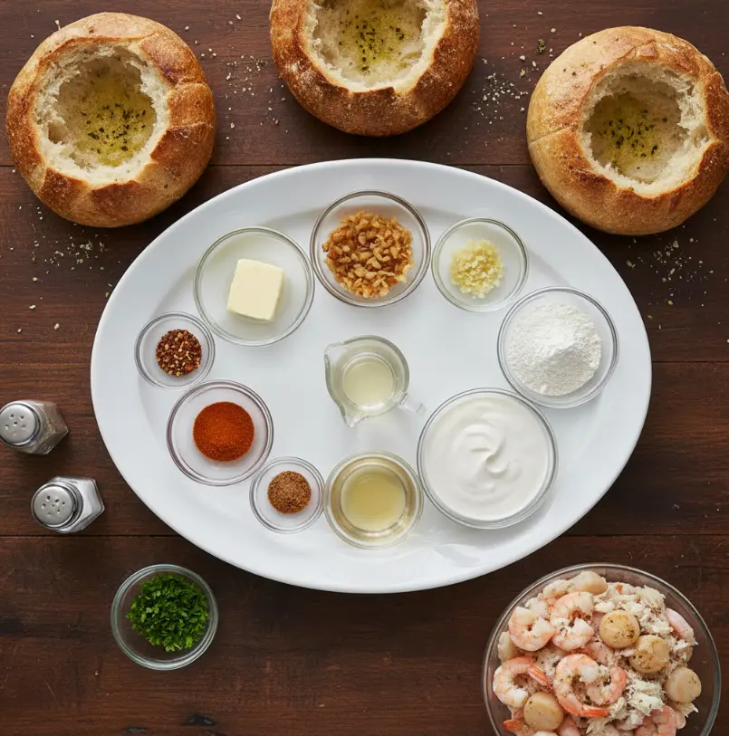 Creating the perfect Stuffed Seafood Soup Bread Bowl starts with quality ingredients that work in harmony. Here’s what you’ll need for four generous servings: