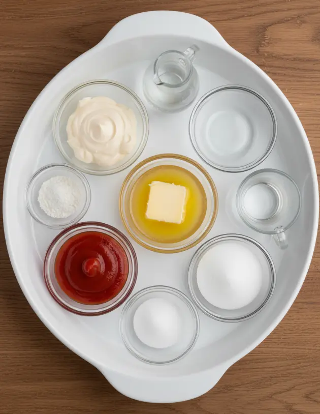 - Add ketchup, melted butter, garlic powder, onion powder, vinegar, sugar, and salt.