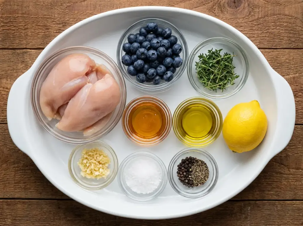 Gather these fresh, pantry-friendly ingredients for your Blueberry Thyme Chicken. This recipe serves 4, yielding tender chicken smothered in a glossy, tangy blueberry-thyme sauce that’s equal parts sweet, herby, and zesty. Sensory note: Imagine the pop of juicy blueberries mingling with earthy thyme and a honeyed glaze—pure bliss!