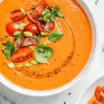 Easy Refreshing Gazpacho Recipe is a chilled, no-cook tomato soup packed with fresh vegetables, olive oil, and zesty lemon. This classic Spanish-inspired cold soup is light, hydrating, and perfect for summer lunches, appetizers, or healthy vegan meals.
