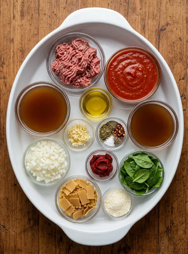 Gather these simple pantry staples for your high protein lasagna soup—most are everyday items that’ll have your kitchen smelling like Nonna’s. I’ve included sensory notes and subs to make it foolproof: