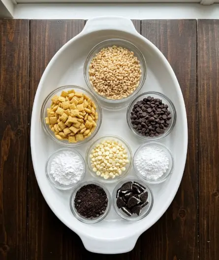 Cookies and Cream Muddy Buddies Ingredients (Makes ~12 cups – trust me, make double)