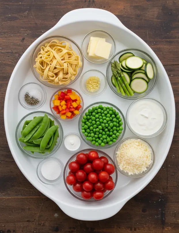 Gather these fresh, simple ingredients for your creamy pasta primavera. This spring pasta shines with seasonal veggies that add color, texture, and nutrition—think juicy bursts and tender snaps that make every bite exciting.
