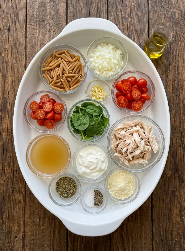 Gather these wholesome ingredients for four hearty servings of our creamy protein-packed pasta bowl. We’ve chosen each one for maximum flavor, nutrition, and ease – think sustained energy from fiber-rich pasta and a protein punch from Greek yogurt and chicken. Sensory notes: Expect the bright pop of cherry tomatoes, earthy spinach wilt, and a garlicky aroma that fills your kitchen.