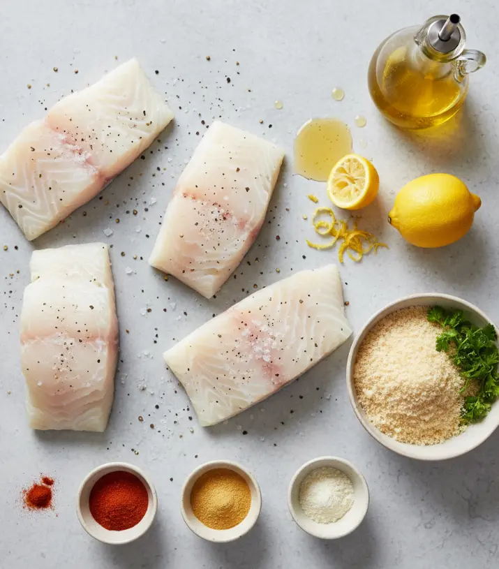 Gather these fresh, simple ingredients to create your Crispy Baked Cod masterpiece. This recipe serves 4 and emphasizes quality for that burst of zesty, herbaceous flavor. Imagine the aroma of lemon zest mingling with savory Parmesan – it’s a sensory delight that elevates everyday oven-baked cod into something special.
