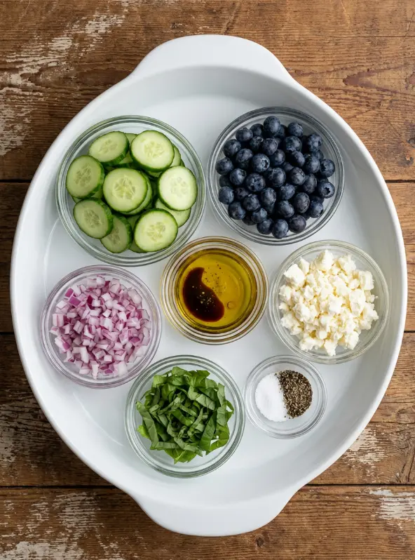 Start by prepping the star players in a large mixing bowl. Peel and halve 4 cups of English cucumbers lengthwise, scoop out the seeds with a spoon for maximum crunch, then slice into half-moons. Add 1 pint of blueberries, 1/4 cup finely diced red onion, 3/4 cup crumbled feta, and chiffonade 8-10 basil leaves (stack, roll, and slice thinly). Pro tip: Chill the bowl beforehand for an extra-refreshing cucumber feta salad that wows on hot days—readers swear it amps up the crisp factor by 20%!