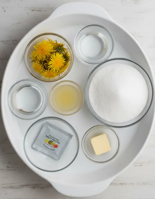Gather these simple, mostly pantry-staple items to whip up about 4-5 half-pint jars of luminous dandelion jelly. The floral notes from the petals shine through, evoking hints of honey and citrus—perfect for toast, tea, or charcuterie boards.