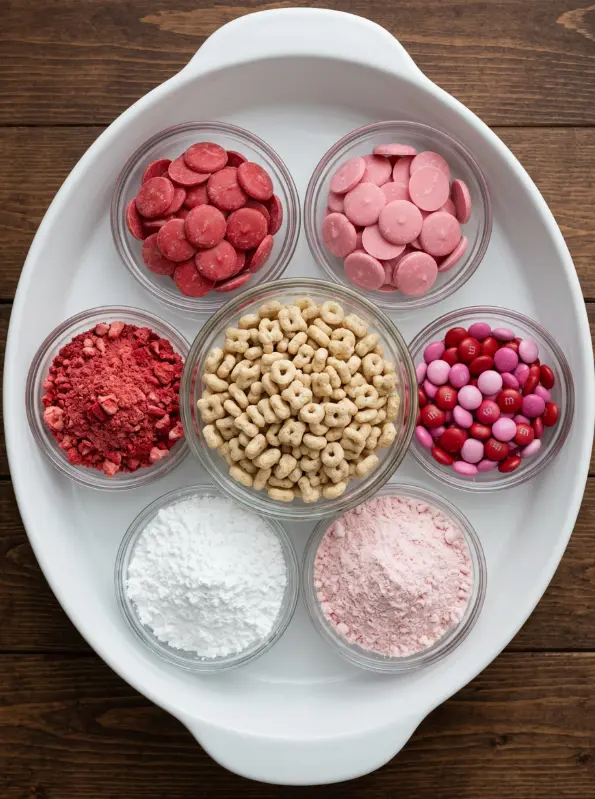 Pour 5 cups vanilla Chex into two medium bowls (about 2.5 cups each). This split ensures perfect pink-and-red layering for visual pop. Personal hack: If feeding picky eaters, keep colors separate until the end for customizable grabs.