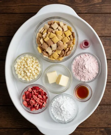 The beauty of this strawberry shortcake puppy chow recipe lies in its short, accessible ingredient list that delivers maximum flavor impact. Here’s everything you need to make about 6 cups of this addictive snack: