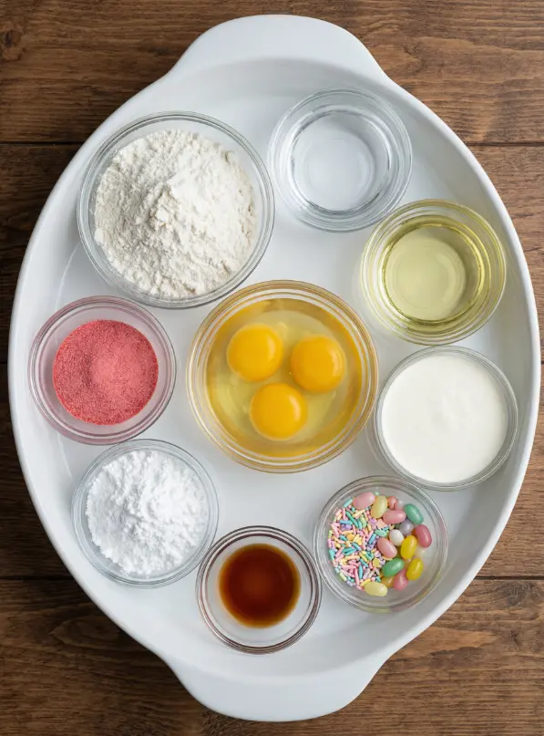 Gather these simple staples for your Easter poke cake—no fancy pantry required. This recipe serves 12-16 generously, with sensory notes to get your taste buds tingling: think tender vanilla crumb, tangy strawberry zing, and zesty lemon brightness.