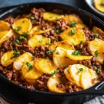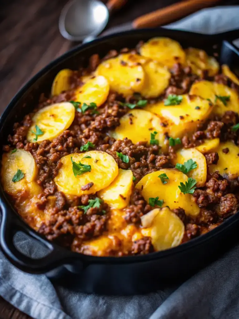 Keywords: cheesy ground beef and potatoes, ground beef skillet recipe, easy comfort food, one-pan beef dinner