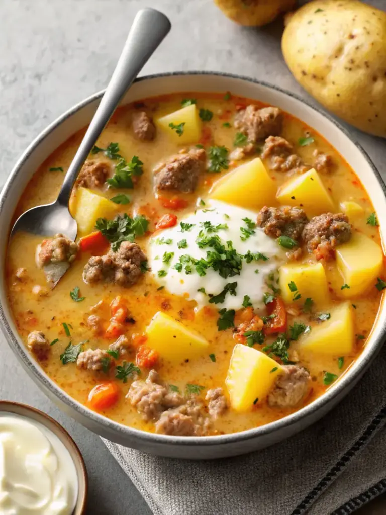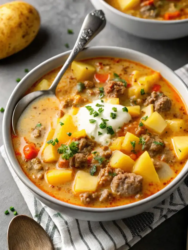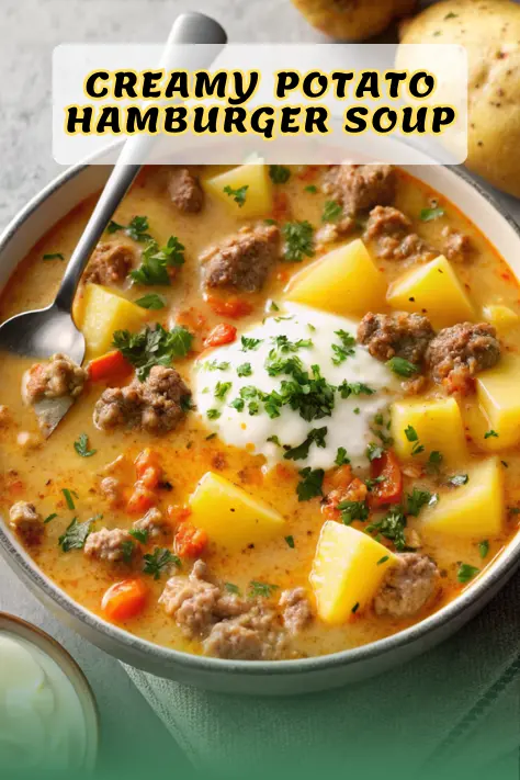 This cheesy hamburger potato soup combines ground beef, tender potatoes, and sharp cheddar cheese in a creamy base. A quick and hearty comfort food recipe that delivers maximum flavor with minimal effort.