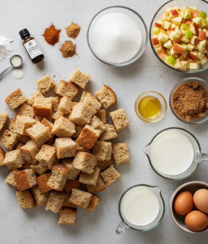 In a large bowl, combine your cubed day-old bread and diced apples. Stale bread is preferable over fresh, as it holds its shape best when it’s soaked in custard. The bread-to-apple ratio creates perfect texture contrast in every bite.