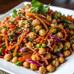 Top your finished crunchy Thai chickpea salad with freshly chopped cilantro, roasted peanuts, and a light sprinkle of sesame seeds. Cilantro adds a fresh, bright element that elevates the entire dish, while the nuts provide textural contrast and additional protein.