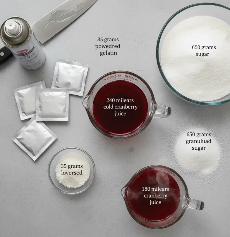 Creating these cranberry jelly candies starts with a handful of simple, high-quality ingredients that evoke the tangy essence of fresh cranberries. I’ve included sensory descriptions to get your mouth watering—imagine the vibrant red hue and zesty aroma filling your kitchen! Here’s what you’ll need for about 49-64 pieces, depending on your cuts: