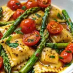 This easy 25-minute cheese ravioli with asparagus, tomatoes, and herbs is a fresh, vegetarian pasta recipe made with tender ravioli, crisp asparagus, juicy cherry tomatoes, and aromatic herbs. It’s a quick, flavorful one-pan meal perfect for busy weeknights or light spring dinners.