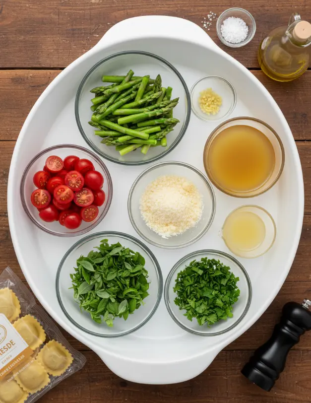 Gather these fresh, pantry-staple ingredients for your ravioli with asparagus, tomatoes, and herbs—think crisp green spears, juicy bursts of cherry tomatoes, and aromatic herbs that dance on your palate. This recipe serves 4, yielding hearty portions bursting with Mediterranean flair.