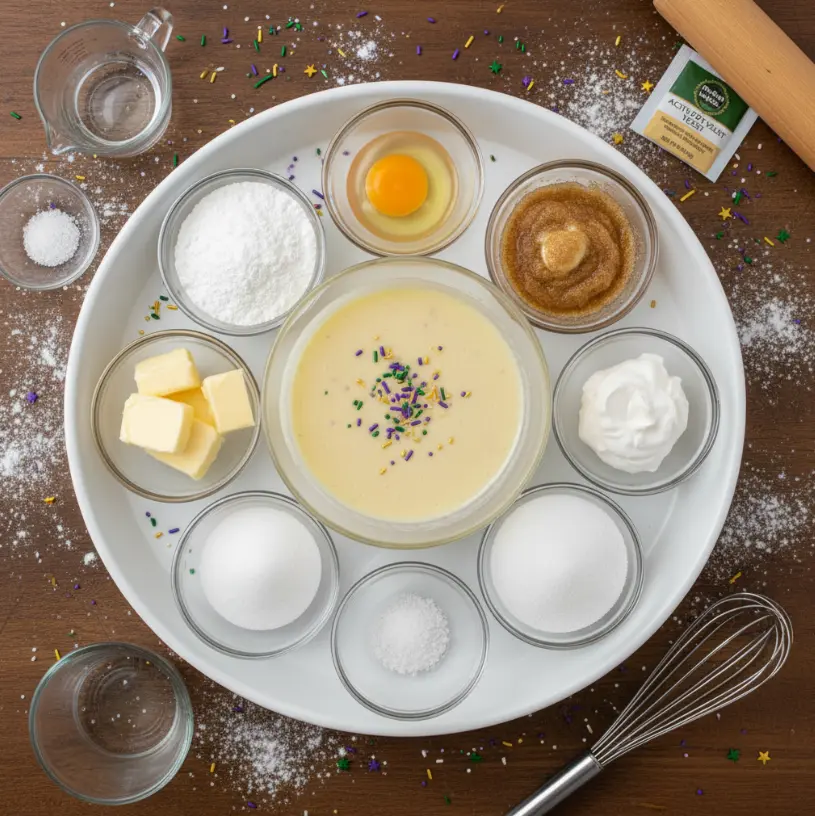 Creating an authentic traditional king cake requires quality ingredients and careful measurement. Here’s everything you’ll need: