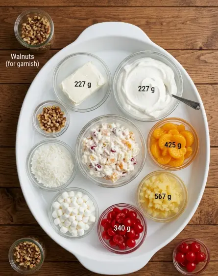 Important Technique: Drain the canned fruits for at least 10–15 minutes (or press gently in a sieve) to remove excess liquid. Too much juice is the top reason fruit cocktail ambrosia salad becomes soupy.