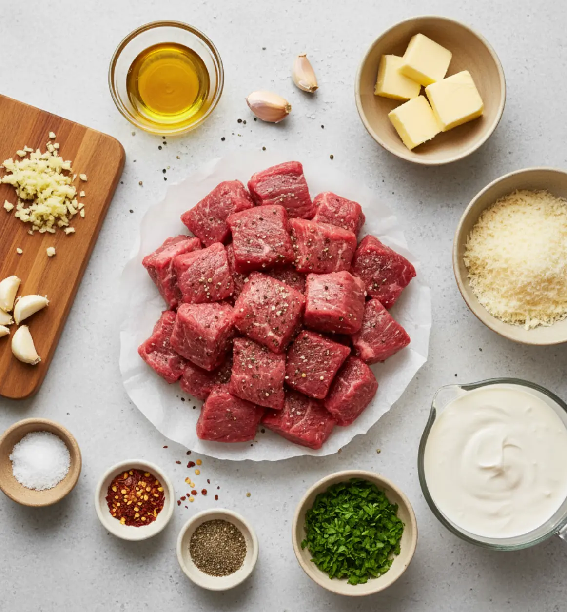 Here’s everything you need to create these garlic butter steak bites with parmesan cream sauce. Each ingredient plays an essential role in delivering the rich, savory flavors that will make your taste buds dance.