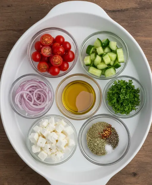 Whip up this vibrant cucumber feta salad with fresh, pantry-staple ingredients that scream summer. Each component adds a burst of texture and flavor—think crisp crunch from cucumbers, sweet pops from tomatoes, and creamy saltiness from feta. Here’s everything you need for 4 servings: