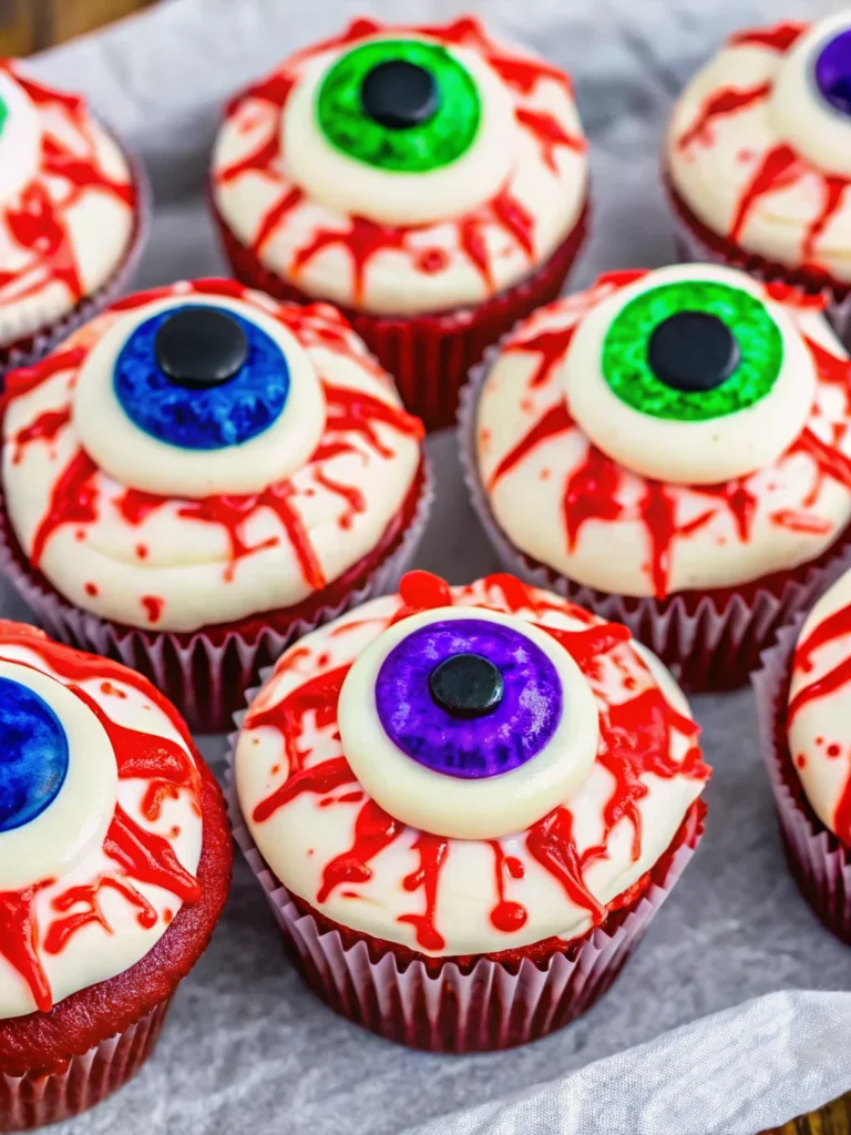 Keywords: eyeball cupcakes, halloween cupcakes, spooky desserts, red velvet cupcakes