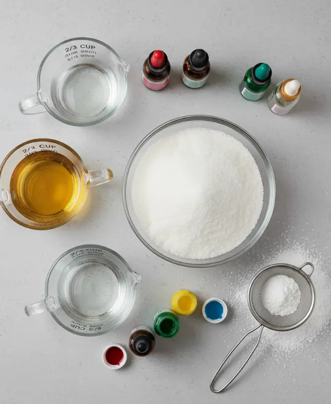 Optional Substitutions: Replace corn syrup with glucose syrup, use natural colorings, or swap extracts for concentrated candy oils.
