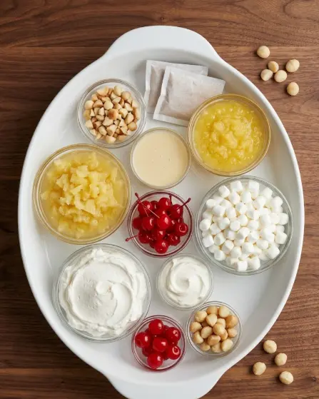 Creating the perfect Hawaiian Pineapple Coconut Fluff starts with quality ingredients that work together to deliver bright flavor and contrasting textures. Here’s exactly what you’ll need for 8 generous servings: