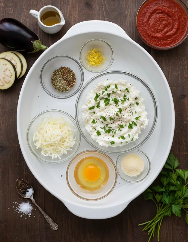 Gather these fresh, simple ingredients for 4 servings of eggplant rollatini that deliver smoky, herby perfection. Sensory note: Imagine the earthy tang of eggplant mingling with bright lemon zest and gooey mozzarella—pure comfort!