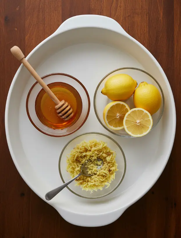 Crafting your honey lemon ginger tea starts with fresh, vibrant ingredients that burst with flavor and health perks. This recipe yields about 2 cups of infused syrup, enough for 20+ servings. Here’s what you’ll need: