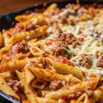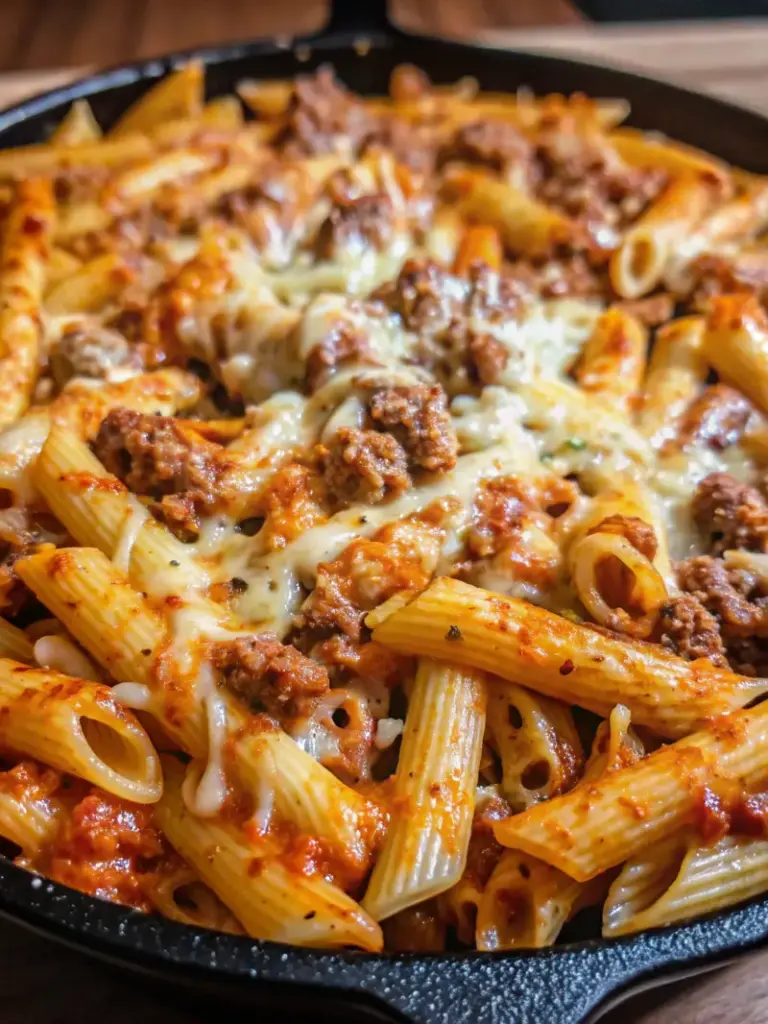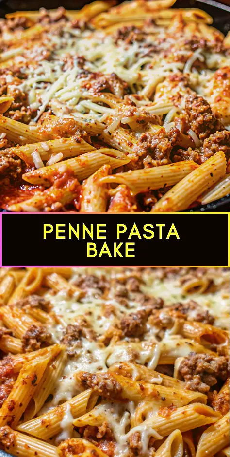 A comforting penne pasta bake made with ground beef, rich tomato sauce, and melted mozzarella and Parmesan cheese—perfect for busy weeknights or family dinners.