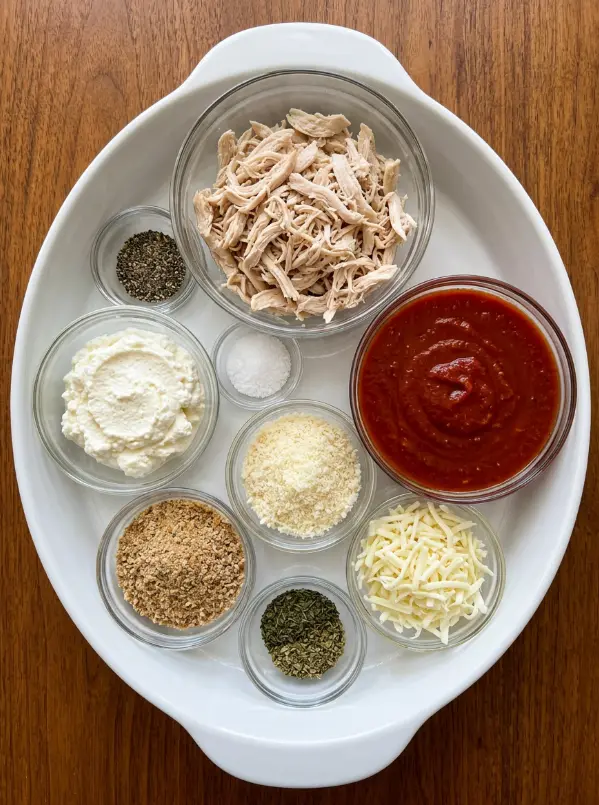 Gather these simple, pantry-staple ingredients for your high protein chicken parmesan casserole. We’ve included sensory notes and substitutions to make it customizable for any diet—think creamy ricotta mingling with tangy marinara and golden, crispy breadcrumbs for that irresistible crunch.