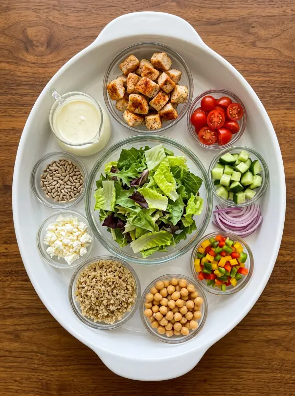In a large bowl, toss mixed greens, halved cherry tomatoes, diced cucumber, sliced red onion, bell peppers, chickpeas, quinoa, sunflower seeds, and feta. Engaging hack: Add greens last to avoid wilting—keeps it crisp for days.